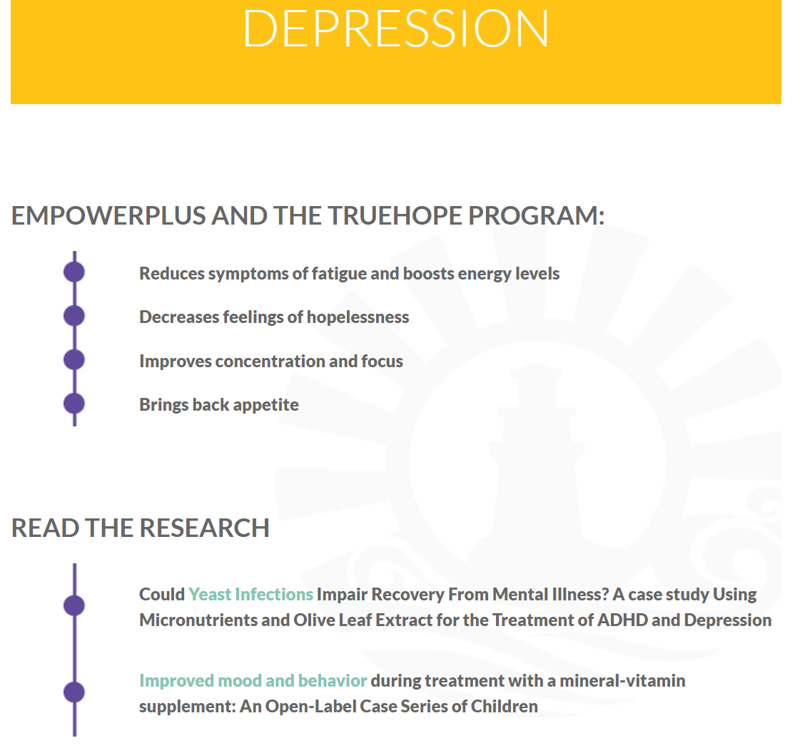 The following screenshot is what Truehope has on its website with regard to the EMPowerplus Truebhope Program and depression.